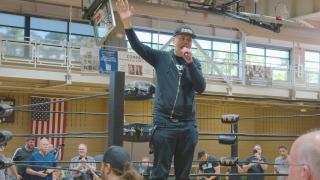 Rainstorms, but the show must go on. Wrestlers join the band on stage, including Bryan Idol - but only Billy approves.